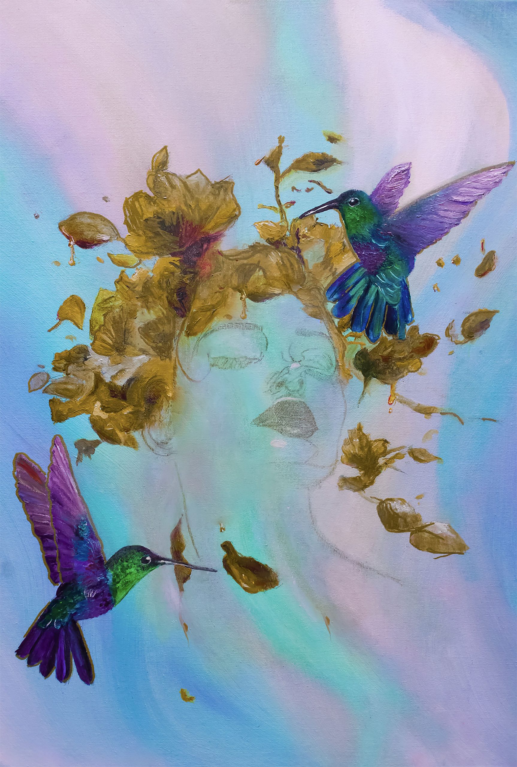 My practice blends mixed media, layered textures, and experimental mark-making to produce immersive works. Female portraits, wings, and birds are recurring motifs, symbolising freedom, resilience, and transformation—echoing both personal experience and broader feminist narratives.